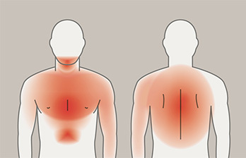 Dabei zählt dies lediglich zu einem gängigen Symptom von Muskelverspannungen im Brustbereich. Doch auch Erkrankungen der Brust- und Bauchorgane können sich in Rückenschmerzen äußern. Verdauungsstörungen wie Sodbrennen Verdauungsstörungen sauren Rückfluß und Geschwüre können starke brennende Schmerzen im Brustraum führen. Schmerzen im Brustkorb können auf einen drohenden Herzinfarkt hinweisen Die koronare Herzkrankheit KHK ist durch Verengungen der Herzkranzgefäße gekennzeichnet. Brustschmerzen können aber viele andere Ursachen haben so zum Beispiel Erkrankungen der Lunge der Speiseröhre oder des Bewegungsapparats. Hierunter fallen unterschiedliche Erkrankungen des Bewegungsapparates also der Muskeln Knochen und Gelenke. Auch im Bereich der Rippen bis hin zum Bauch können Schmerzen während des Hustenstoßes auftreten.